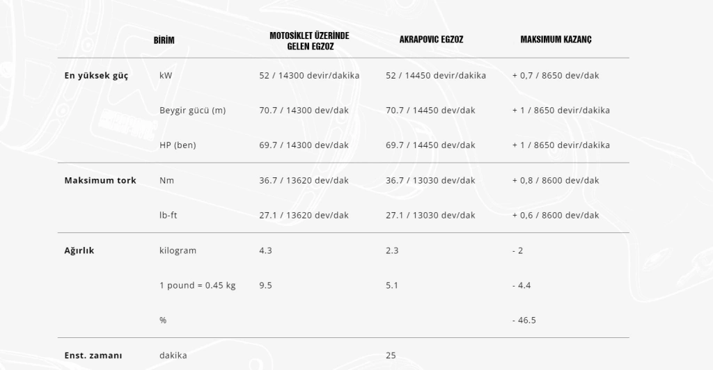 Bu egzoz motosikletin ve sportif görünümüne uyması için daha kompakt bir şekle sahiptir. El yapımı karbon fiber parçalar kullanılarak üretilmiş olup ve mükemmel şekilde yarışlarda kanıtlanmış malzemede titanyum uç kapağı ile tamamlanmıştır. Güç ve tork, tüm aralıkta artar ve standart stok sistemine göre ağırlık tasarrufu, gelişmiş performansa katkıda bulunur. Daha fazla işitsel keyif için zenginleştirilmiş bir ton sunar ve EC/ECE tip onaylıdır. Yeniden eşleştirme gerektirmez.Egzoz sistemi ZX-4RR versiyonuna ’da uygundur.Model: KAWASAKI NINJA ZX-4R (23-26) Ürün No : S-K4SO8-HRCGüç Bilgileri:[power]Güç: +0,7 kW - 8650 rpm[torque]Tork: +0.8 Nm - 8600 rpm[weight]Ağırlık:-2.0 kg Kutu içeriği pdf dosyasını indirmek için tıklayınız. EC belgesi pdf dosyasını indirmek için tıklayınız. ECE belgesi pdf dosyasını indirmek için tıklayınız. Kurulum talimatları pdf dosyasını indirmek için tıklayınız.