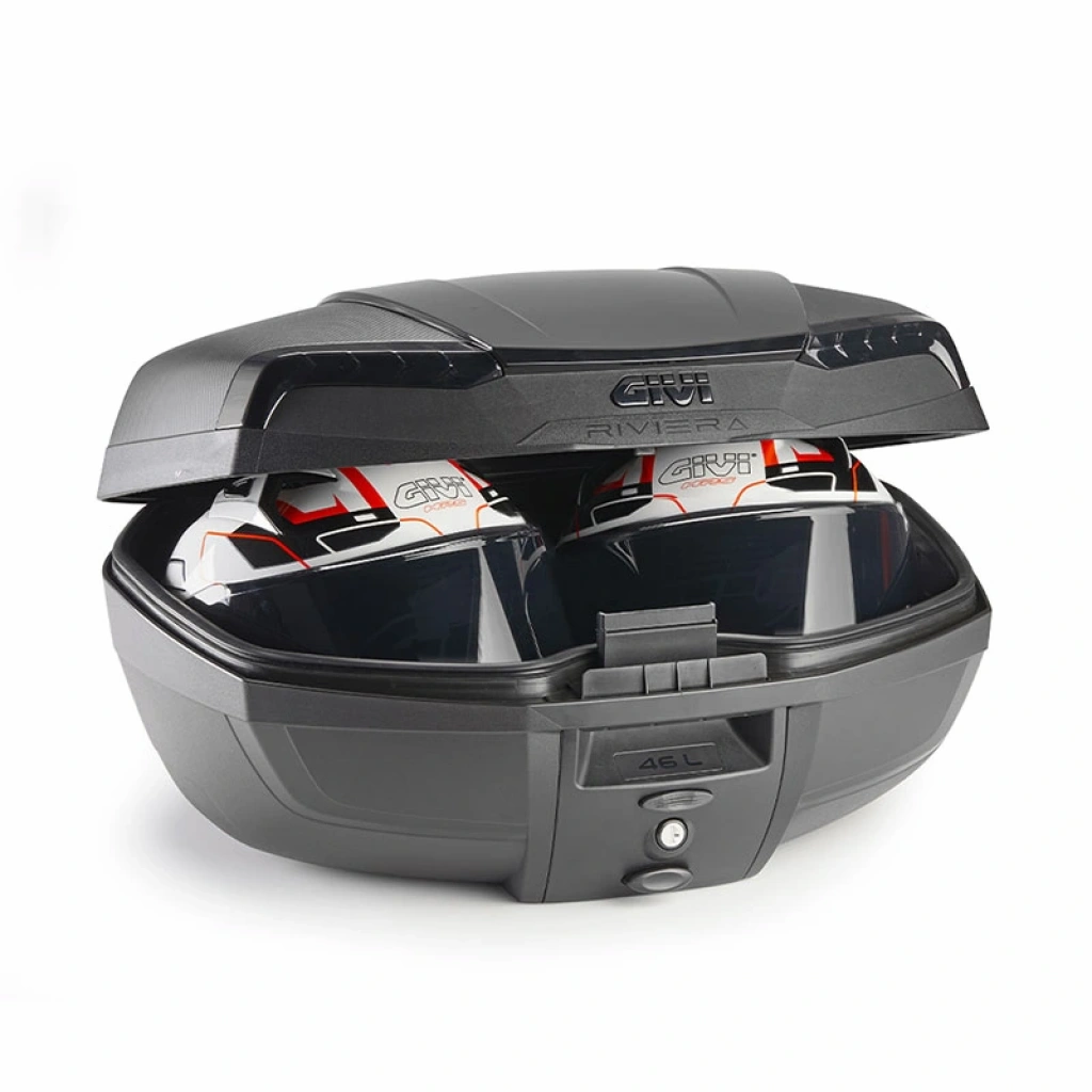 GIVI E46NB RIVIERA ÇANTA (MONOLOCK)[kumas]MALZEME• Çizilmeye dayanıklı yüzey• Aerodinamiğe fayda sağlayan yuvarlak hatlar• Uzun ömürlü estetik kalite sağlamak için özel iç boya ile kaplanmıştır [havalandirma]ÖZELLİK• 46 Litre kapasite• Fırtına ve doluda hem laboratuvarda hem de yolda çok sayıda testle kanıtlanmış çok yüksek bir su geçirmezlik seviyesi • Otomatik açıp kapama sistemi• Gerektiğinde tek bir hareketle çantayı çıkarıp götürebilme özelliği(anahtarla)• Reflektörlü• Tabla kutu içerisinden çıkmaktadır.• Çift kask alabilir• Genişlik : 57,8cm• Yükseklik : 30,5cm• Derinlik : 44,8cm