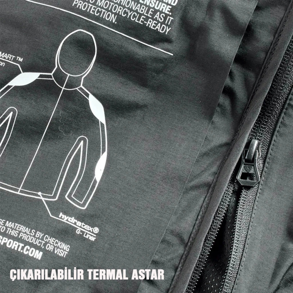 [kumas]MALZEME• A seviye CE sertifikalıdır(EN17092-4:2020)• Yüksek kaliteli 600D yırtılmaz kumaş • Bütün hava koşullarında giyilebilir• 4 mevsim üstün koruma• Touring ve Enduro motosiklet kullanıcıları için tasarlanmış [koruma]KORUMA• CE Seviye 1 Sertifikalı SEESMART ™ dirsek koruyucuları• CE-Seviye 1 Sertifikalı SEESMART ™ omuz koruyucuları• SEESOFT RV Sırt koruması ile uyumludur[ergonomi] ERGONOMİ• VCS fermuar sistemi• Flexisnap raylı ve düğmeli boyun kapatma sistemi• Bel, kol ve bilek bölgelerinde ayarlanabilir kayışlar• Yüksek yansıtıcı özelliğine sahip reflektörler• Yakada ekstra rahatlık için yumuşak kumaş• Kısa bağlantı fermuarı[isi_dengesi] ISI VE ASTAR• Kolayca çıkarılabilir termal astar• Hydratex® | Mesh G-astar• Sırt ve göğüste havalandırma çıkışları [ozellikler] ÖZELLİK• Sırt koruyucu için cep• Aşınma ve yırtılma direnci • Geliştirilmiş özel havalandırma giriş ve çıkış kanalları• 2 ön cep• Termal astar içinde 1 adet cep• Göğüste yırtmaçlı cep